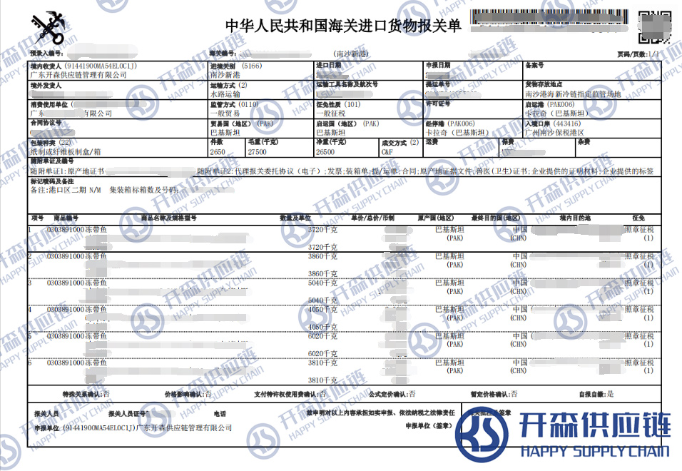 【本文結(jié)語】 上述就是巴基斯坦凍帶魚進(jìn)口報關(guān)清關(guān)代理服務(wù)【經(jīng)典案例】的全部內(nèi)容,希望能對您有所幫助,如有水產(chǎn)品進(jìn)口報關(guān)上任何疑問及問題可隨時在線聯(lián)系我們或撥打 18002611553,開森供應(yīng)鏈擁有豐富的水產(chǎn)品進(jìn)口報關(guān)操作經(jīng)驗及案例,10余年進(jìn)口經(jīng)驗為您所用,各類進(jìn)口疑難都能為您一一解答及協(xié)助快速處理解決!