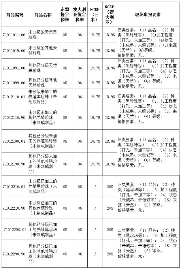 整顆珍珠應(yīng)歸入7101項(xiàng)下,再根據(jù)珍珠種類、天然或養(yǎng)殖等進(jìn)行詳細(xì)歸類。其中,黑珍珠因?yàn)楸容^稀有,價(jià)格較為昂貴,在《中華人民共和國進(jìn)出口稅則》中單獨(dú)列名。從部分國家和地區(qū)進(jìn)口是可以享受優(yōu)惠關(guān)稅的,下面介紹珍珠可能涉及的歸類、規(guī)范申報(bào)要素及進(jìn)口關(guān)稅稅率:
