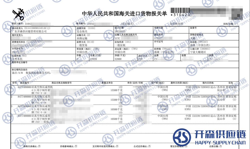 【本文結語】 上述就是寧波港舊真空熱壓成型機進口報關清關代理案例【經(jīng)典案例】的全部內容,希望能對您有所幫助,如有二手機械進口報關上任何疑問及問題可隨時在線聯(lián)系我們或撥打 18002611553,開森供應鏈擁有豐富的二手機械進口報關操作經(jīng)驗及案例,10余年進口經(jīng)驗為您所用,各類進口疑難都能為您一一解答及協(xié)助快速處理解決!
