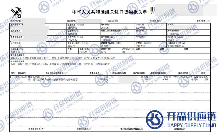 【導讀】您正在閱讀的是關于意大利磨皮生產線進口報關清關代理服務【經典案例】的內容,本文由開森二手機械進口報關代理小編整理編寫;