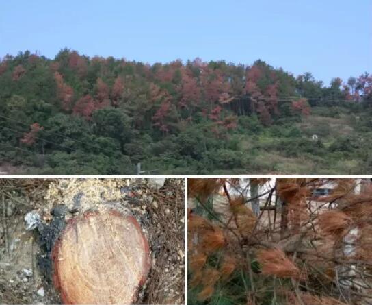 第三階段:大部分針葉變?yōu)辄S褐色,萎蔫,可見(jiàn)到甲蟲(chóng)類的蛀屑;